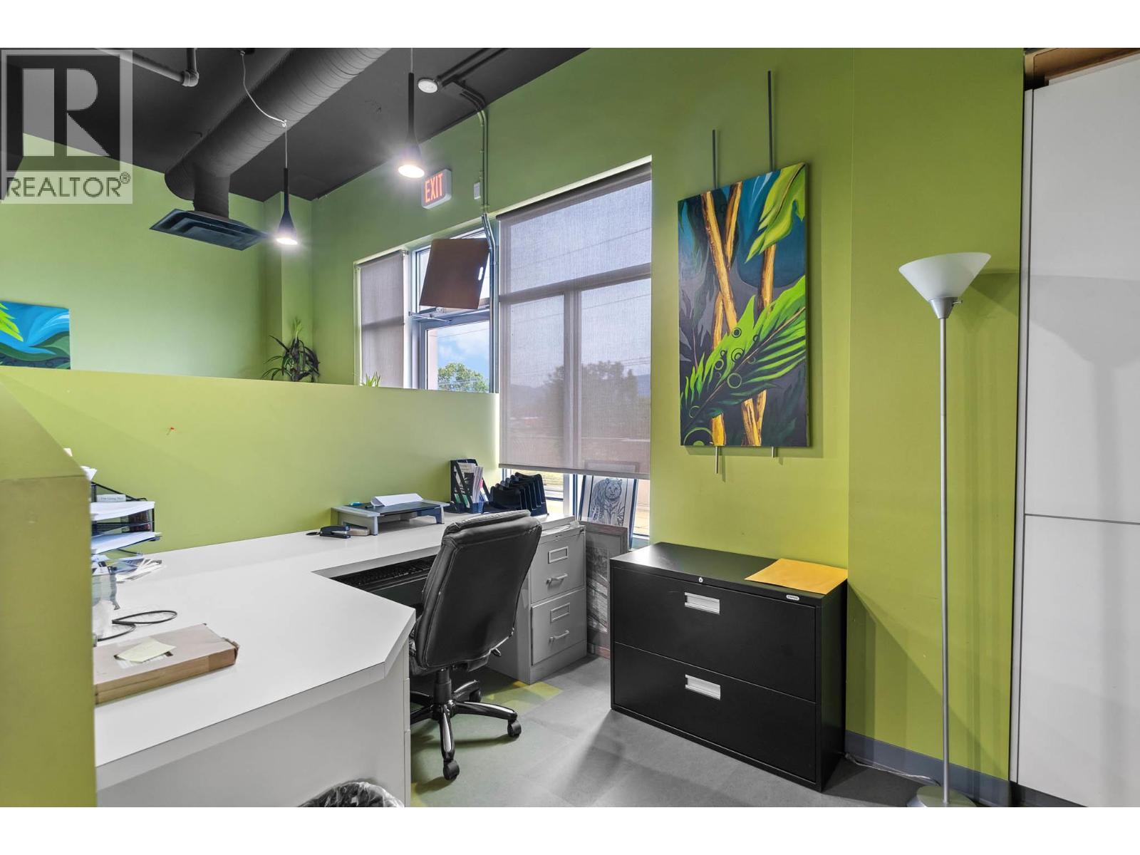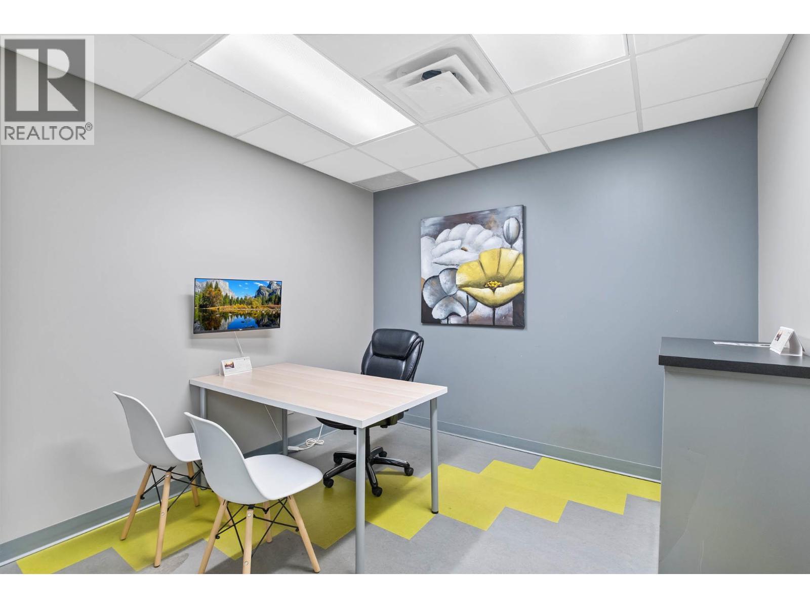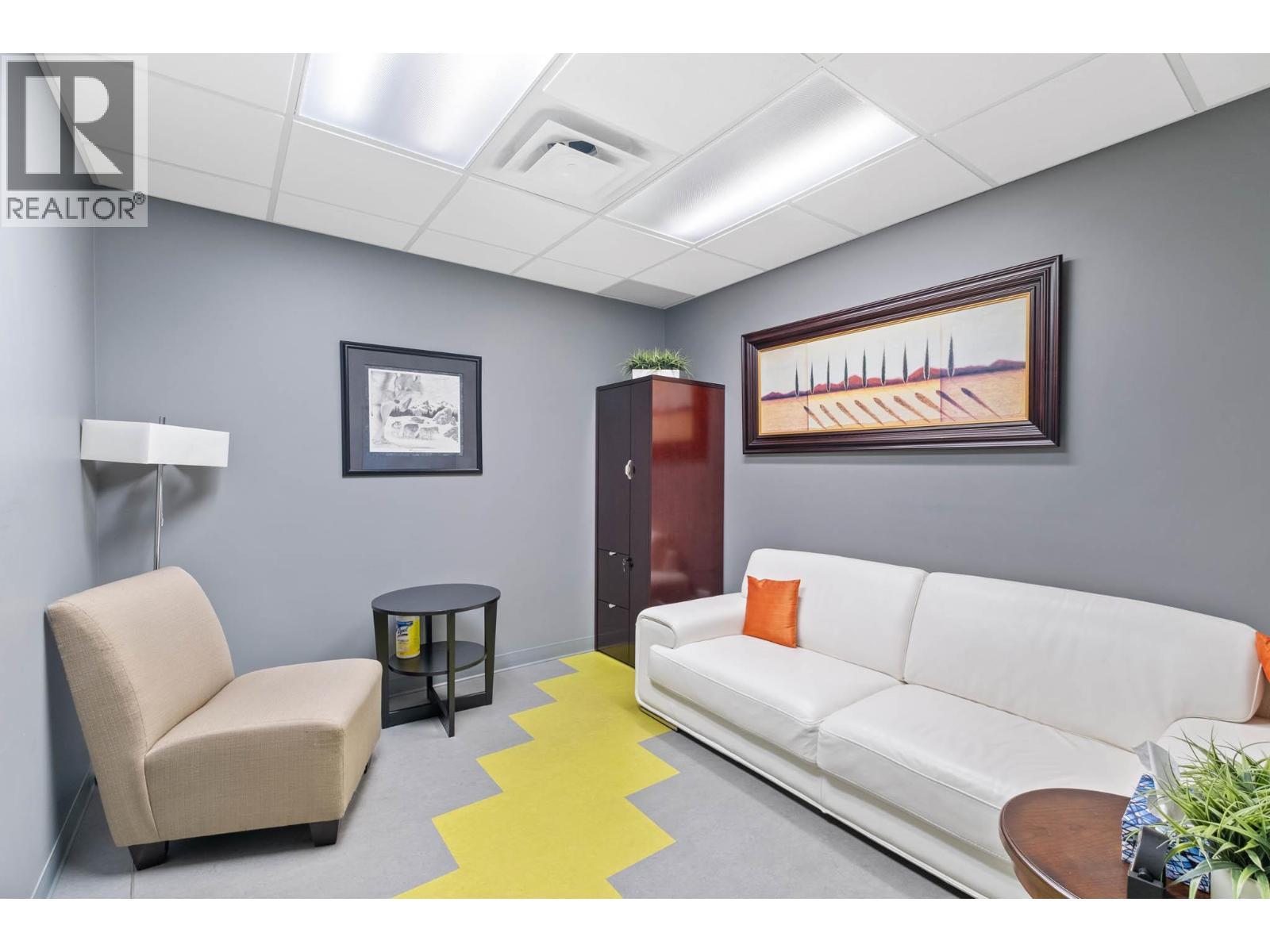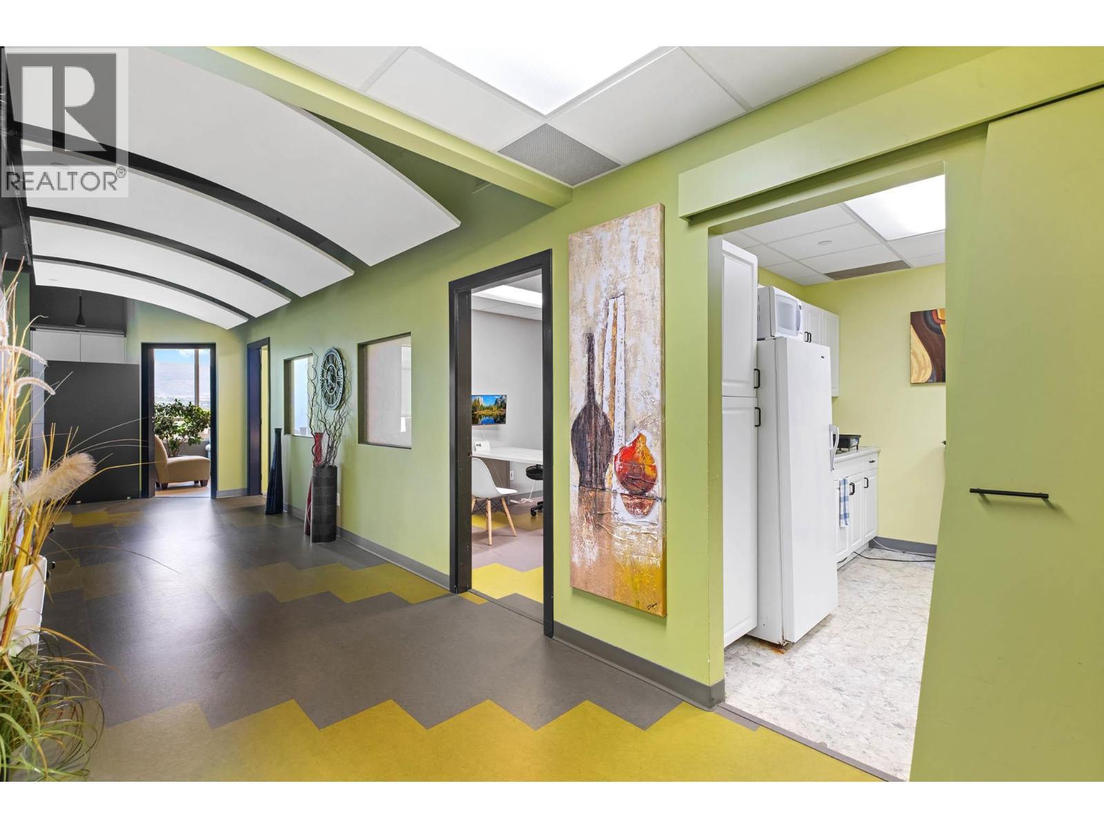 Second-floor Invue commercial unit offering approximately 1,694 sq. ft. in a concrete high-rise. The well-designed floor plan includes a welcoming reception area, 3 private offices, a large open area presently set up in cubicles and a dedicated staff room, complemented by eye catching designer finishes and colours throughout. Ideal for a wide range of professional and service-oriented uses including medical or dental clinic, physiotherapy or wellness practice, accounting or law office, real estate or insurance brokerage, tech or consulting firm, or boutique professional services (subject to applicable zoning). A key advantage is the built-in clientele from the building’s 92-unit residential component, providing consistent foot traffic and convenience-driven demand. The property is exceptionally well positioned in central Kelowna’s midtown core, just steps from Orchard Park Shopping Centre and directly behind Orchard Plaza, placing it within one of the city’s busiest commercial and retail corridors. Surrounded by major employers, transit routes, and established neighbourhoods, this location offers excellent accessibility for both clients and staff, with easy connections to Downtown, Highway 97, and surrounding communities. Additional features include outdoor space, access to common washrooms, two designated underground parking stalls, and visitor parking available on site. An opportunity to secure a high-quality commercial space in a central location. (id:6769)