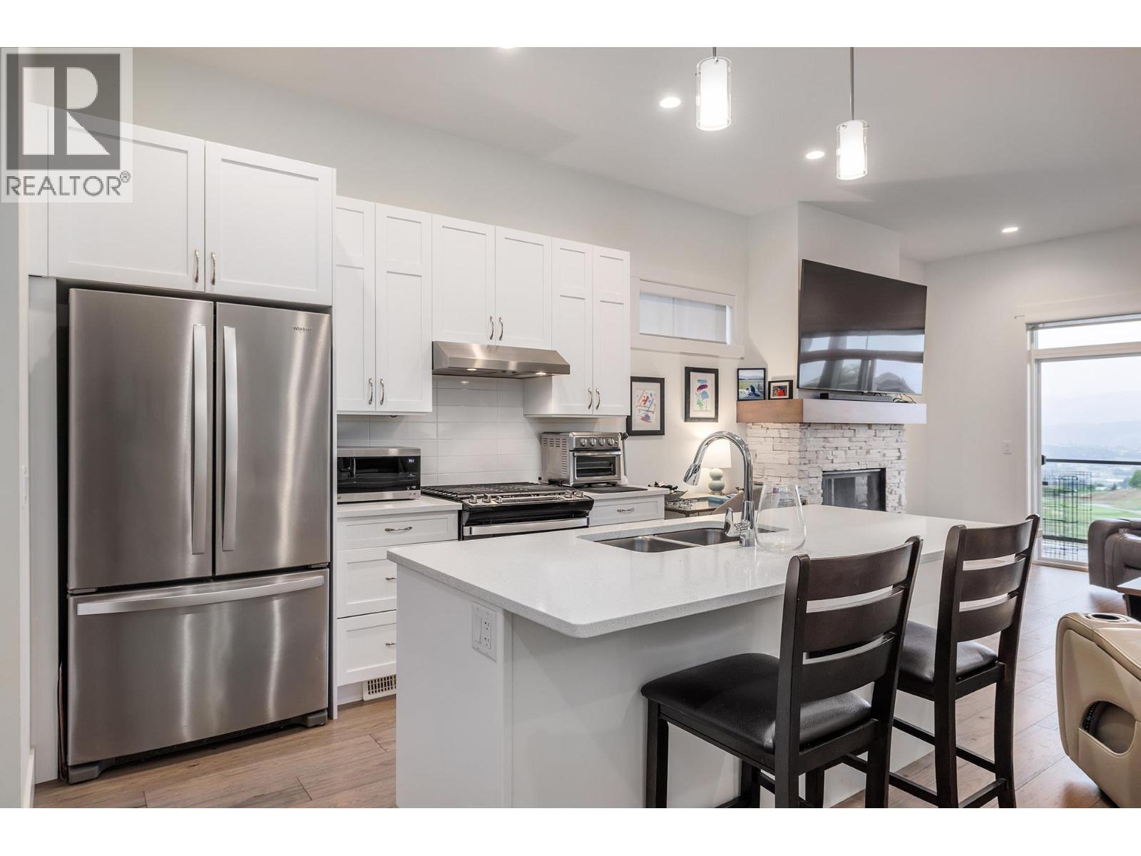 $200/MO LEASE CREDIT FOR THE 1ST 12MONTHS | $100/MO CREDT FOR THE 2ND 12MONTHS. Effortless living overlooking Tower Ranch Golf Course. Welcome to Solstice at Tower Ranch, where serene, low-maintenance living meets panoramic fairway views and upscale finishes. This 2 bedroom plus recreation room, 3 bathroom leasehold home is perfectly positioned to capture the sunsets, lake views, and sweeping green space from both levels. Thoughtfully upgraded throughout, the home features engineered hardwood flooring, quartz countertops, heated tile floors, and soft-close cabinetry. The bright kitchen is a chef’s delight, with a gas range, centre island, and Whirlpool stainless steel appliances. The open-concept living area centers around a fireplace with stone surround and flows seamlessly to a covered upper deck with gas BBQ hookup, making it ideal for year-round entertaining. The spacious primary retreat offers deck access, a custom closet, and a spa-inspired en-suite with a floating vanity with two undermount sinks and tiled glass door shower. Downstairs, enjoy a bright walk-out recreation room, guest bedroom with walk-in closet, and a private lower patio with city, lake, and golf course views. Extras include central air conditioning, central vacuum, HRV system, and single garage with driveway parking. Just minutes to YLW, wineries, and hiking trails, this is Okanagan living made easy. (38743735)"" (id:6769)