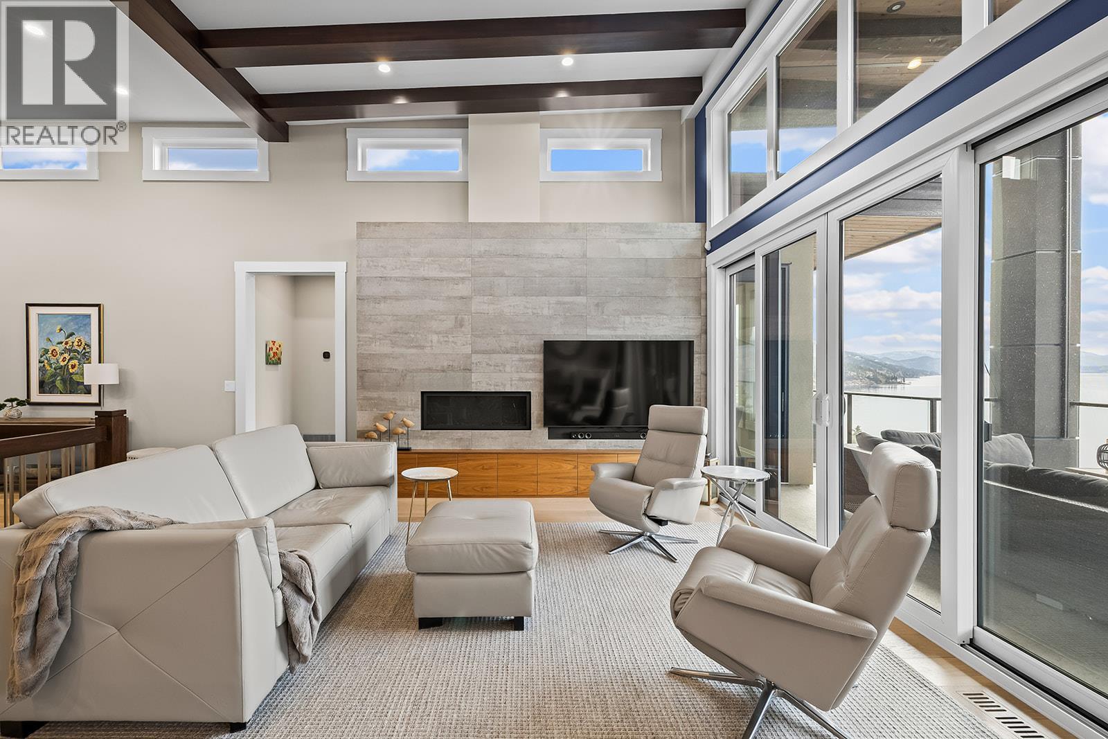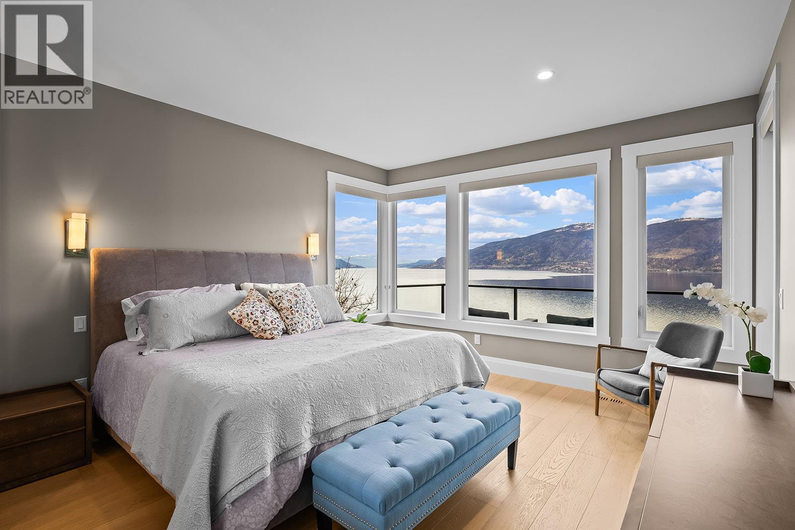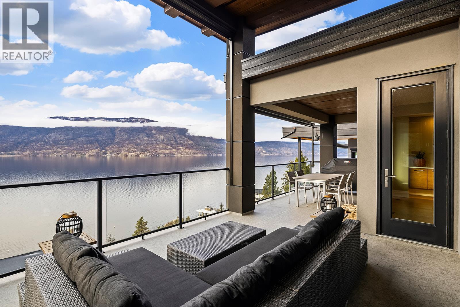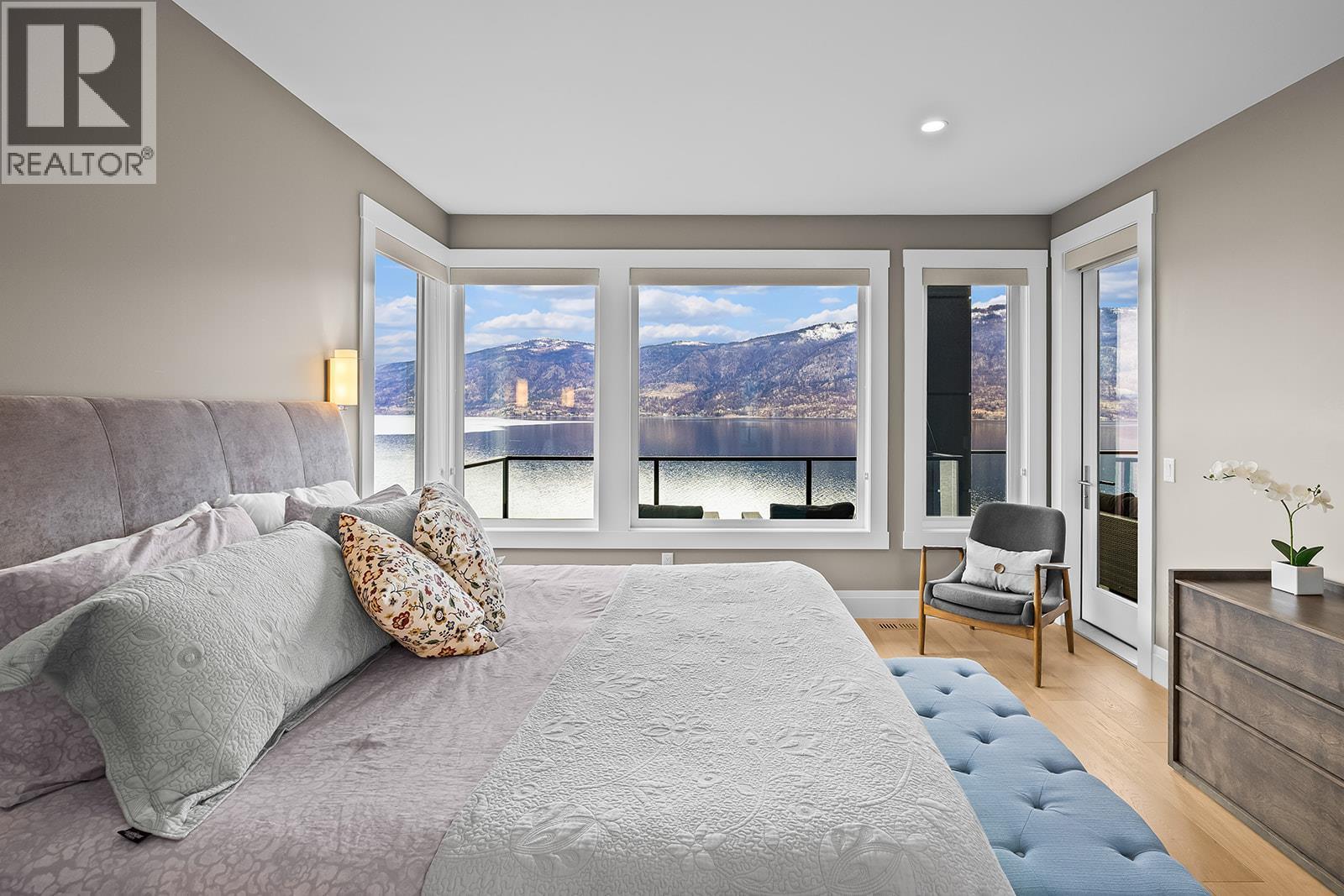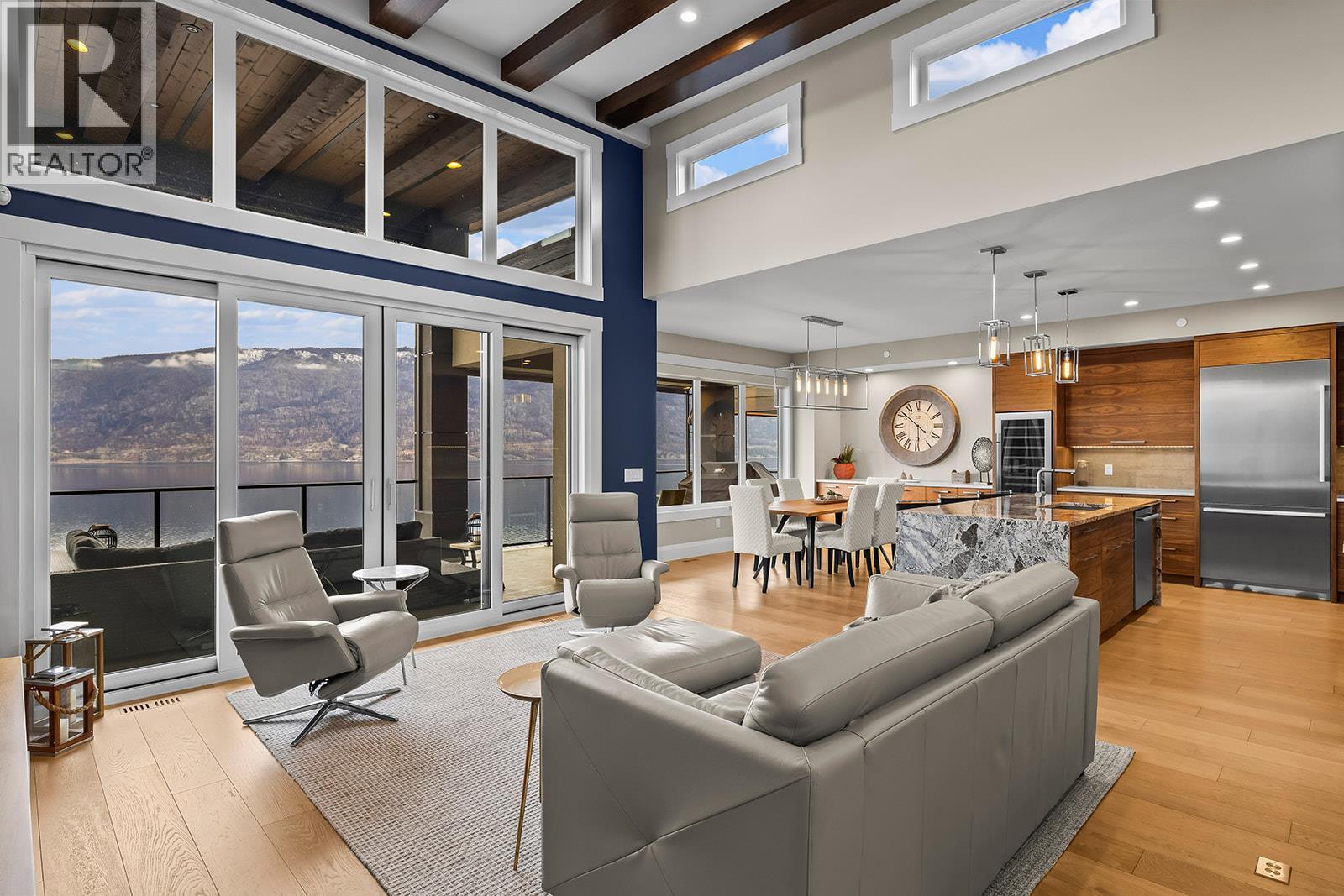 Don't miss out on this stunning home with breath taking views of the lake and mountains in this exclusive Lakestone waterside in lake country. This home has barley been lived in and is in pristine condition. The moment you enter the front door, you're embraced into a space where luxury meets comfort. The panoramic lake view stretches from the bridge in the south to Fintry in the north. Enjoy the main floor great room , with cedar beams, cozy fireplace, professionally designed kitchen with Thermador appliances, stone countertops, dedicated wine fridge and custom horizontal grain walnut cabinetry. The architectural details continue with striking beams leading out to the large deck designed for entertaining, and enjoying the vibrant sunsets. The primary suite on the main floor has a lavish ensuite with oversized walk-in shower, soaker tub, and wiring for hot tub on the aggregate covered deck . The lower level offers a spacious rec. room with a wet bar, 2 additional bed rooms and 2 full bathrooms. The state of the art amenities center in Lakestone include 2 pools, 2 fitness facilities, basket and pickle ball courts, shared dock, endless walking and hiking trails, and a quick walk to the lake access. (id:6769)