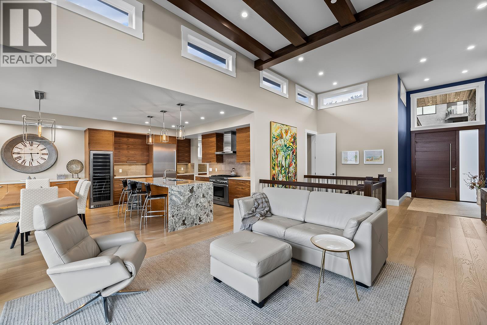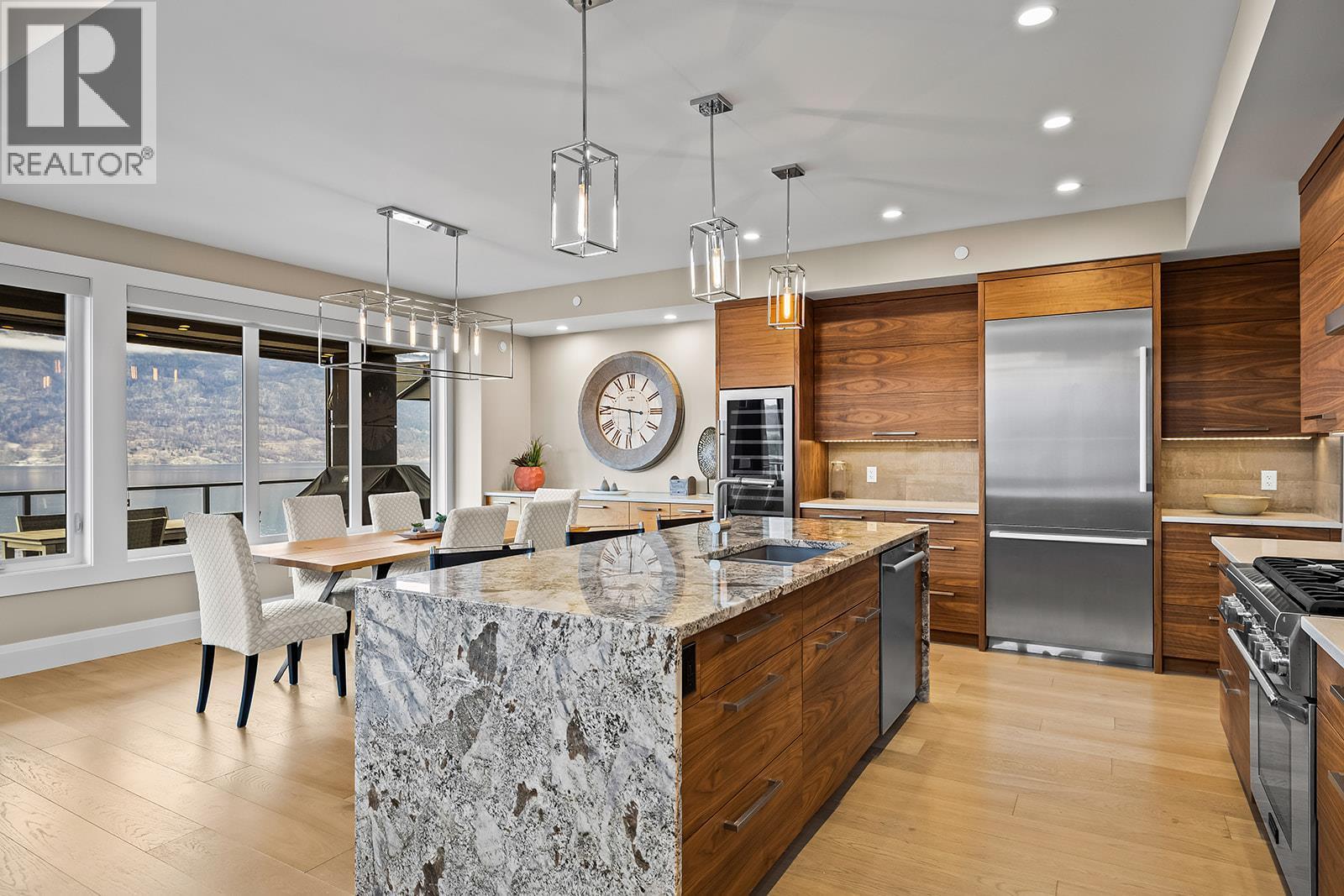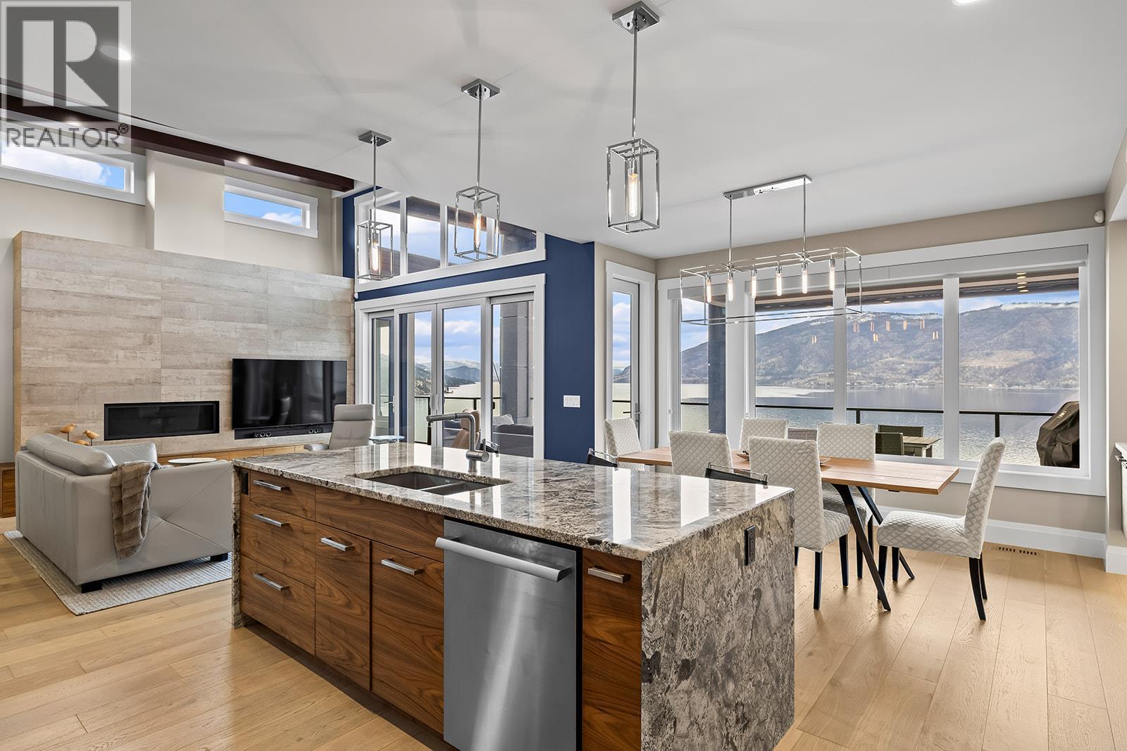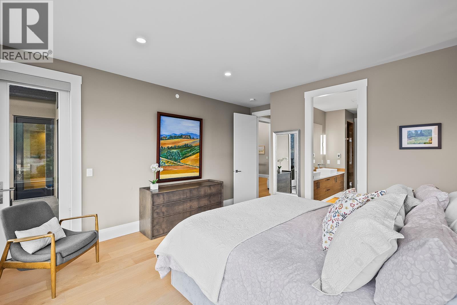 Don't miss out on this stunning home with breath taking views of the lake and mountains in this exclusive Lakestone waterside in lake country. This home has barley been lived in and is in pristine condition. The moment you enter the front door, you're embraced into a space where luxury meets comfort. The panoramic lake view stretches from the bridge in the south to Fintry in the north. Enjoy the main floor great room , with cedar beams, cozy fireplace, professionally designed kitchen with Thermador appliances, stone countertops, dedicated wine fridge and custom horizontal grain walnut cabinetry. The architectural details continue with striking beams leading out to the large deck designed for entertaining, and enjoying the vibrant sunsets. The primary suite on the main floor has a lavish ensuite with oversized walk-in shower, soaker tub, and wiring for hot tub on the aggregate covered deck . The lower level offers a spacious rec. room with a wet bar, 2 additional bed rooms and 2 full bathrooms. The state of the art amenities center in Lakestone include 2 pools, 2 fitness facilities, basket and pickle ball courts, shared dock, endless walking and hiking trails, and a quick walk to the lake access. (id:6769)