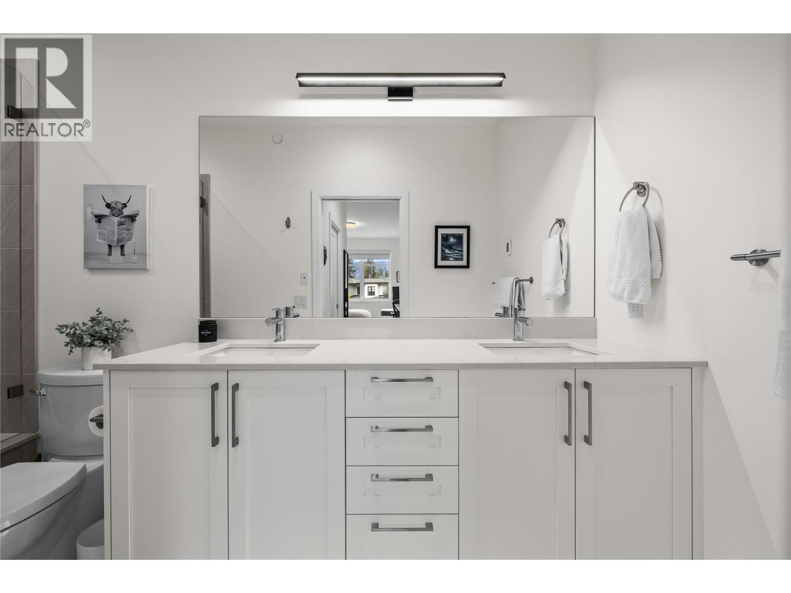 Discover refined living at Quail Landing, an exclusive enclave along the 18th hole of the Championship Quail Course. This beautifully crafted home blends sophisticated design with everyday comfort. Bright interiors by Hatch Interior Design showcase wide-plank German-made laminate flooring, 9’ ceilings, expansive sliding doors for seamless indoor-outdoor living, and privacy film on all windows. A sleek linear stone fireplace anchors the living space, while smart thermostats and energy-efficient systems ensure year-round comfort. The chef-inspired kitchen features premium KitchenAid appliances, including a 5-burner gas range, quiet dishwasher, and French-door fridge, complemented by quartz countertops, soft-close shaker cabinetry, and a custom island perfect for entertaining. Upstairs, the spa-like ensuite offers heated tile floors, quartz counters, chrome fixtures, and a custom glass shower with bench seating. A spacious 586 sq. ft. crawl space provides excellent storage. Enjoy resident-only amenities including a private firepit, EV charging upgrades, natural gas BBQ hookups, and private road access. Minutes to the airport, UBCO, and walking trails, this well-maintained community also offers green space and a peaceful setting. (id:6769)