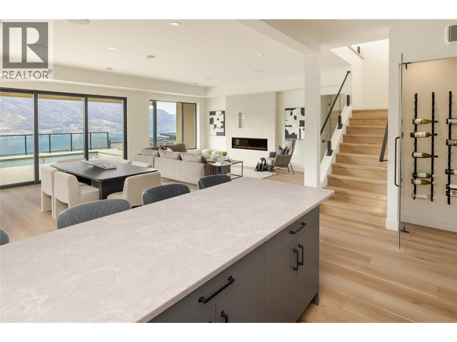 Stunning lake views from this newly completed home on the most private street in North Clifton Estates. This 4300 square foot luxury home features a salt water pool with an auto cover, yard space, a 2.5 car garage, plus driveway space for 2 cars. Enjoy the quiet location beside the mountain with endless hiking trails, and yet still be only an 8 minute drive to Kelowna's lively downtown core. Featuring 4 bedrooms, 4 bathrooms and an office, this home is open concept with an elegant and organic modern vibe. There are (2) 4 panel multi slide doors in the upper and lower levels, creating a beautiful indoor/outdoor feel. Features include a climate controlled wine room, 2 fireplaces with custom finishes, a gorgeous lighting package, soaring ceilings and hardwood floors on the main level. Extra luxuries include built in speakers, a security system, epoxy floors in the garage and a 2 zoned heating and cooling system. The lower level rec room has tones of space, plus there is another open space for either a theater room, gym or playroom. Professional landscaping includes a fenced yard, with room for garden boxes or extra space for the dogs and kids, and low maintenance, irrigated plantings with syn lawn- which means no mowing:) (id:6769)