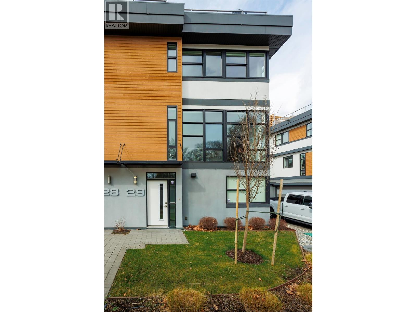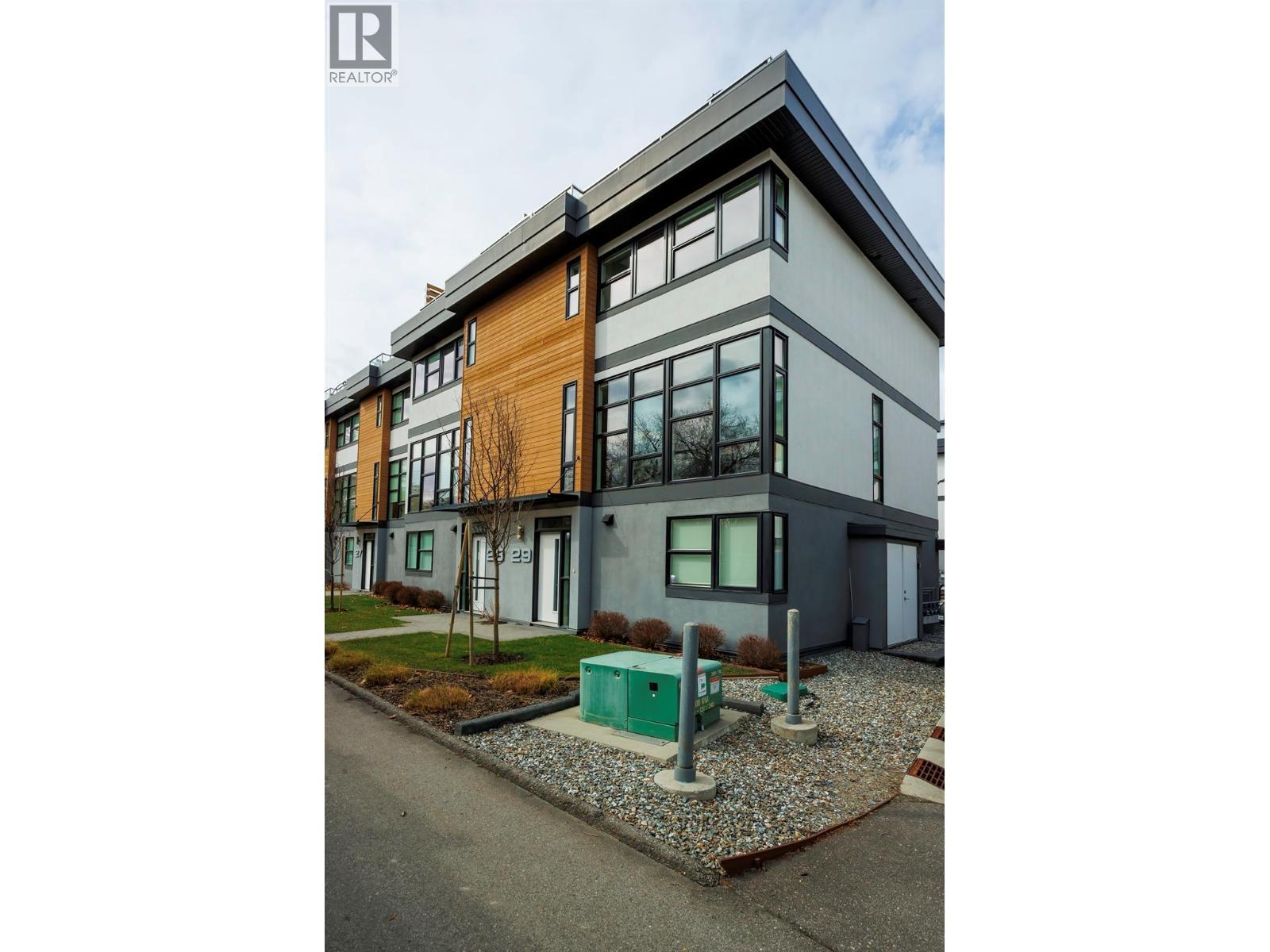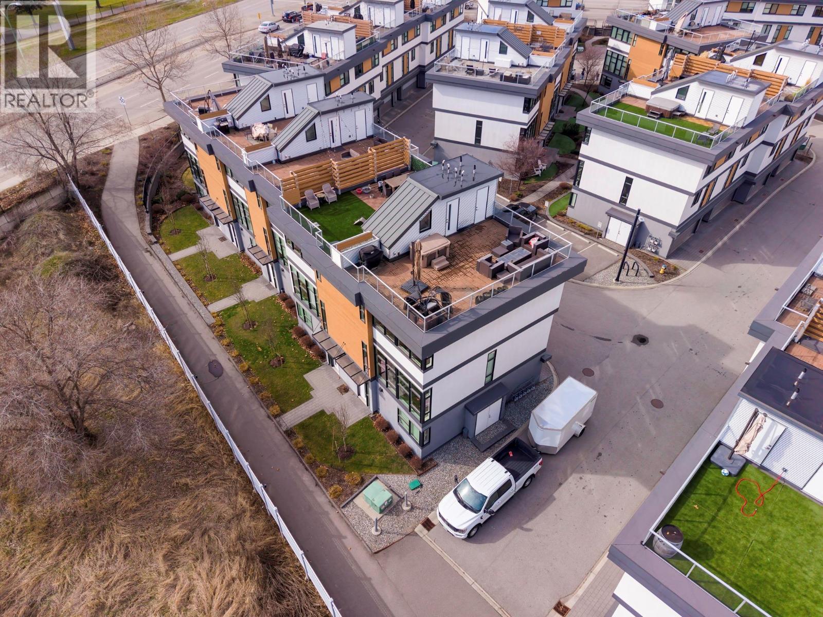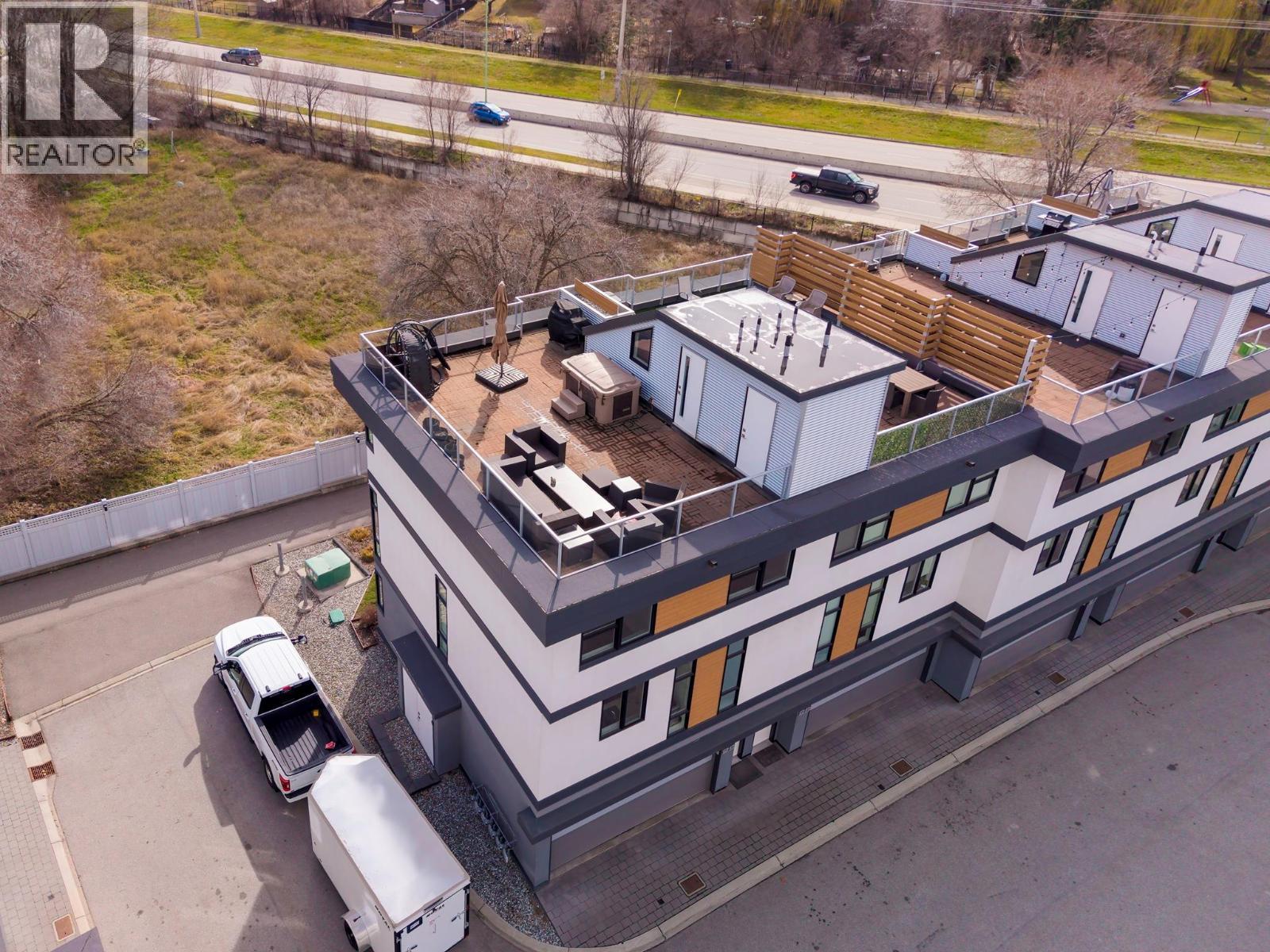 Best location in the development. This 3-bedroom end-unit townhome sits in the quietest, most private position, elevated and set apart with greenspace out front and no direct views in from other units. Southeast exposure brings in excellent natural light, with views from both the living room and primary bedroom. The open main floor features floor-to-ceiling windows, power blinds in the living room, and clean, modern finishes throughout. The kitchen is well laid out with a full stainless appliance package including gas range and steam dryer, plus upgraded window coverings already in place. End-unit design adds four extra windows, creating a brighter, more open feel than interior units. Upstairs, the 588 sq.ft. rooftop patio offers a true outdoor living space with city and mountain views, plus a more functional layout unique to end units. Upgrades include anextended garage built to fit full-size trucks, hands-free skirted toilets, and a newer high-end Eco Spa hot tub. Visitor parking is directly across, with additional room in front of the garage for easier access and maneuvering. Built with geothermal heating and cooling, LED lighting, and quality insulation for efficient year-round comfort. Central location with quick access to downtown Kelowna, Knox Mountain, breweries, restaurants, shops, and the waterfront. One dog or one cat allowed. Award-winning development with 3 Gold Tommie Awards and 2 Silver. (id:6769)